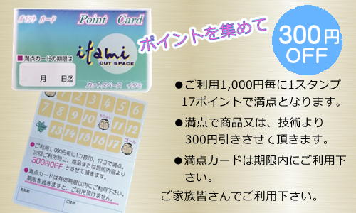 ご来店時にポイントを貯めて、割引を御利用下さい。